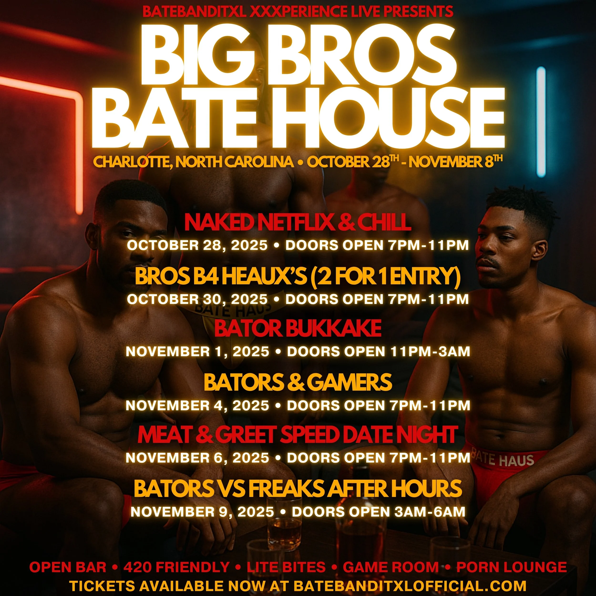 Big Bros Bate House is where the bros link up for a new kind of experience — part residency, part social experiment, and all goon energy. Hosted by BATEBANDITXL, this Charlotte residency blends erotic culture, chill energy, and real connection under one roof.